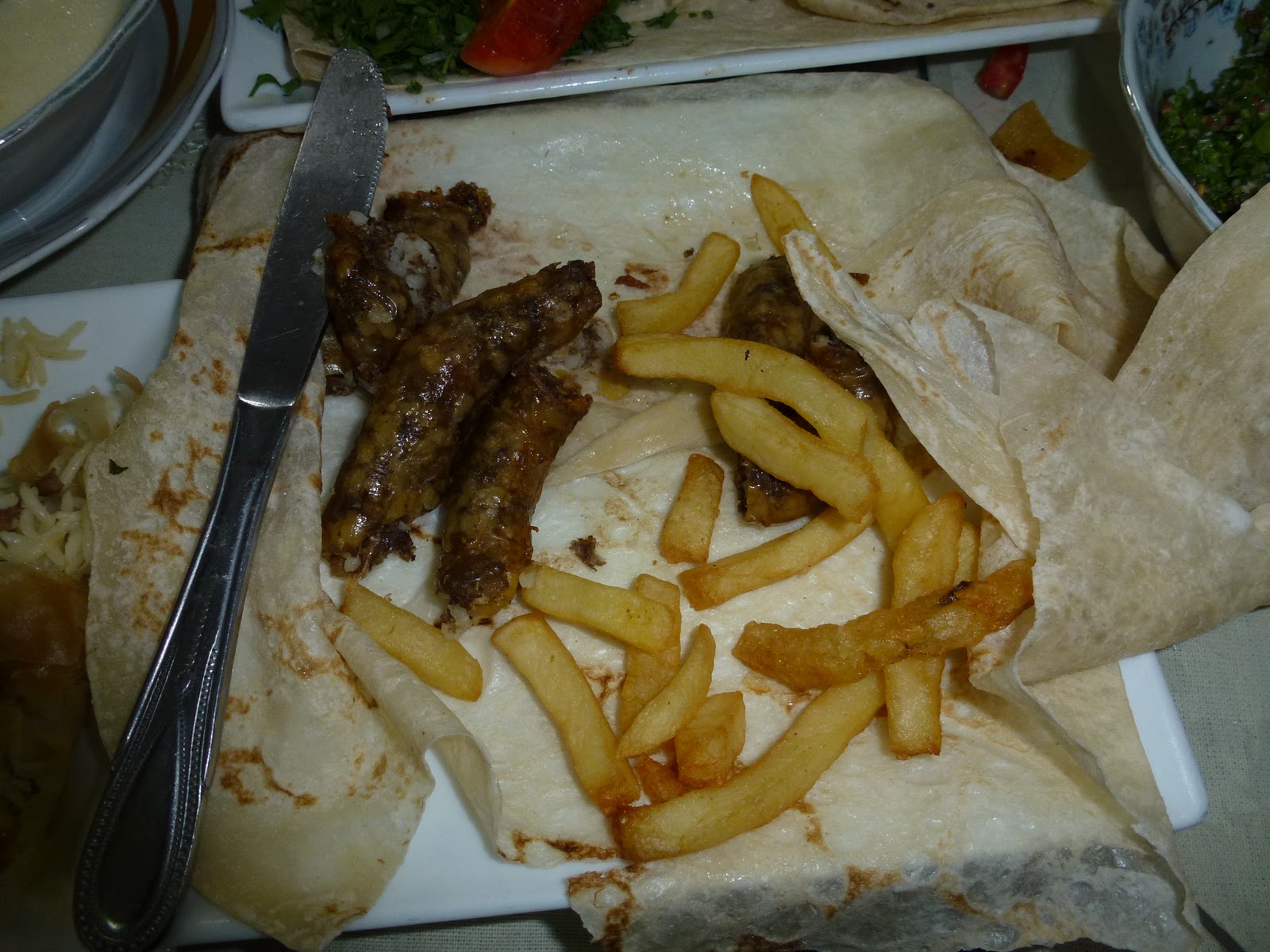 (Syrian Dish: Saj’aat – stuffed intestine with rice served with bread and chips.)