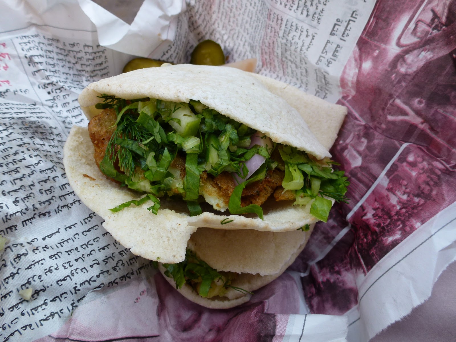 Then comes the second and even cheaper fast food – falafel. Two sandwiches cost me £2.5EGP (around 25p) and that was on the expensive end! Basically its just crushed chickpeas fried and served in some bread and some salad. This one had egg in too which was nice! Oh, and they always insist on you taking pickles!