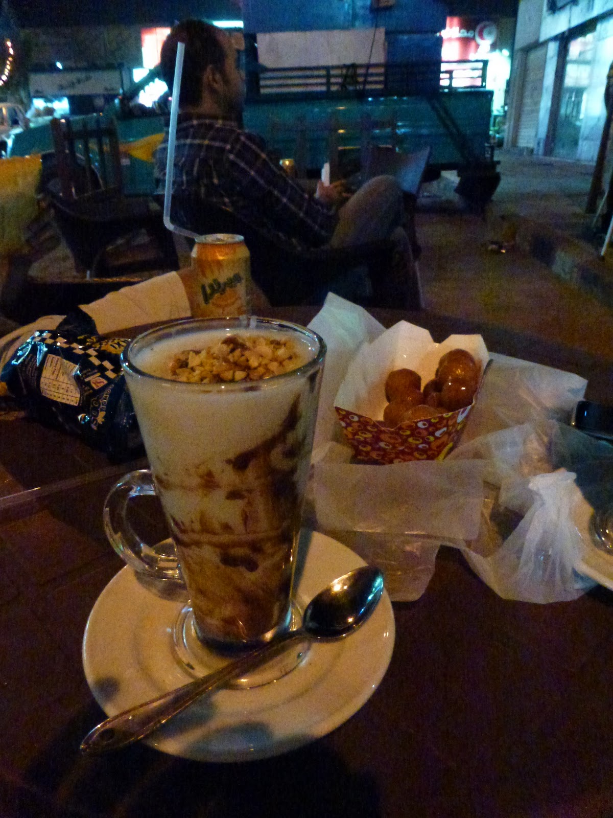 (Drink: Sahlab – a thick yeasty sort of drink I think and Sweet, fried Doughballs alongside it which I can’t remember the name of!)