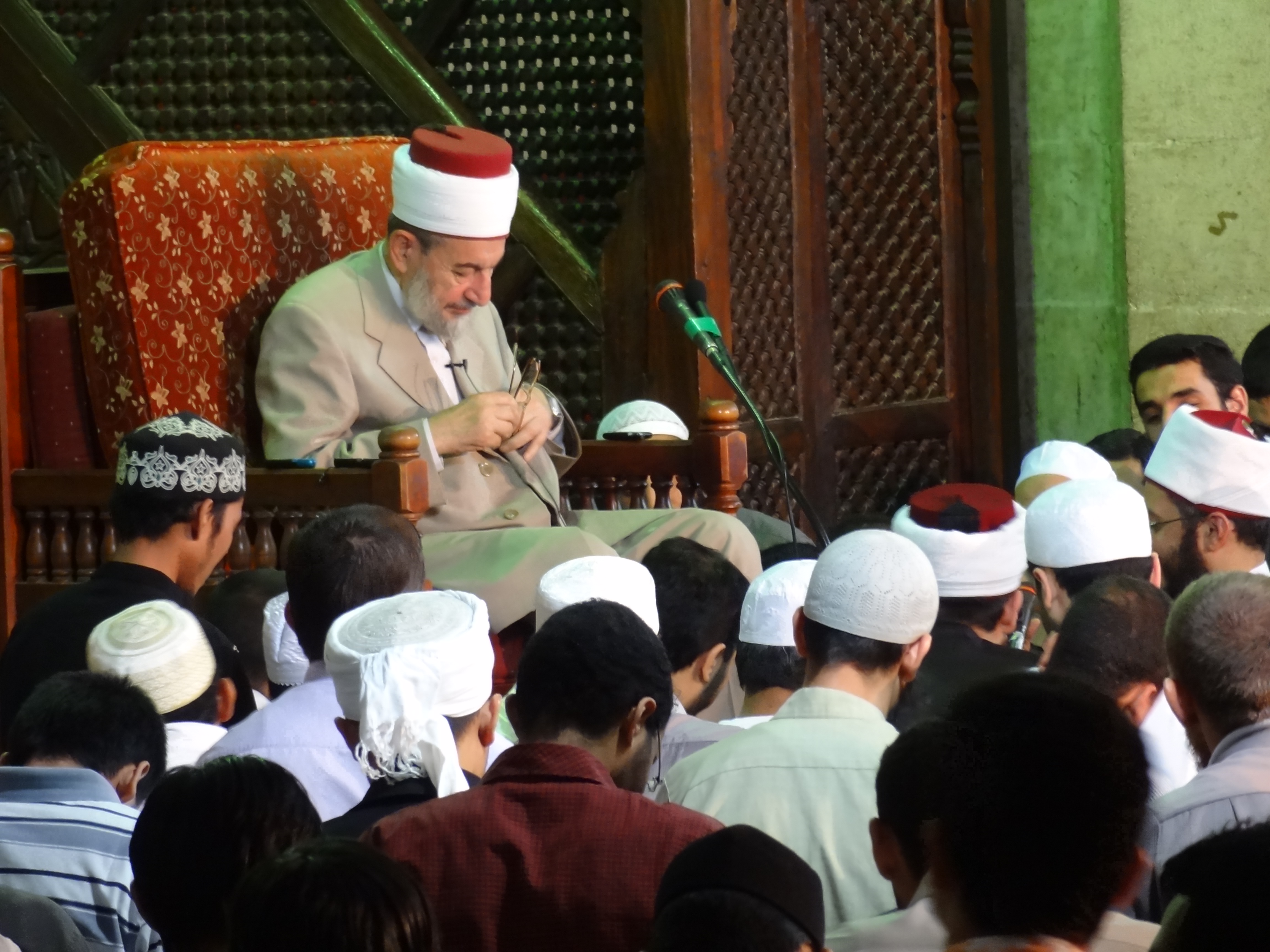 DSC00225 Published February 25, 2012 at 4608 × 3456 in Back to the beginning ← Previous Next → Sheikh Nur Al-Din answers the questions of his students. His most prominent students which include the great scholar Usama Al-Sayed sit attentively at his feet