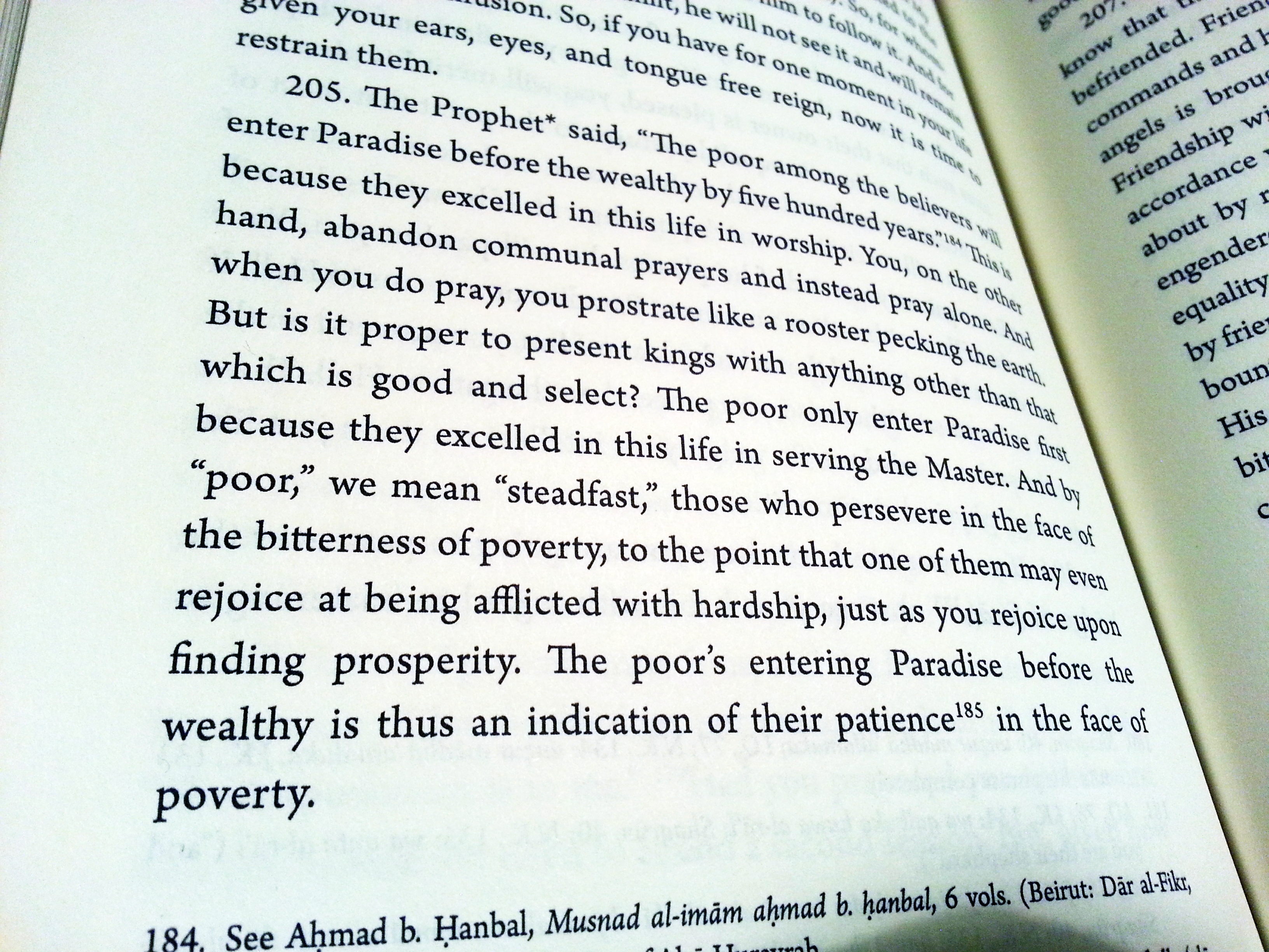 And by ‘poor’, we mean ‘steadfast’, those who persevere in the face of the bitterness of poverty, to the point that one of them may even rejoice at being afflicted with hardship, just as you rejoice upon finding prosperity. The poor’s entering Paradise before the wealthy is thus an indication of their patience in the face of poverty.”