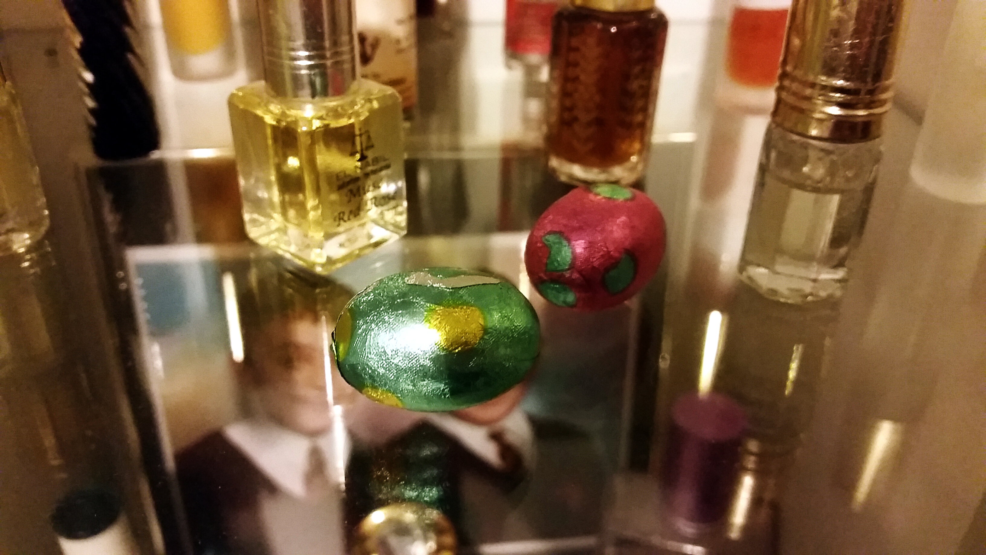 … But just as I was wrong the first time, I was wrong again! Today, as I returned home from class, I noticed two glistening objects found hidden carefully amongst the aftershave – It was the eggs I thought he’d taken. They stood there in plain sight, only one shelf away from where they were before.